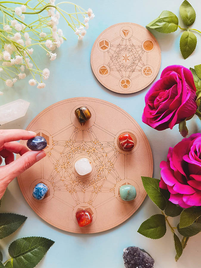 Este diseño es un patrón de creación e inspiración. Tener este símbolo visible en tu espacio, con cristales, es una manera de abrirte a su energía y el fluir universal que representa.