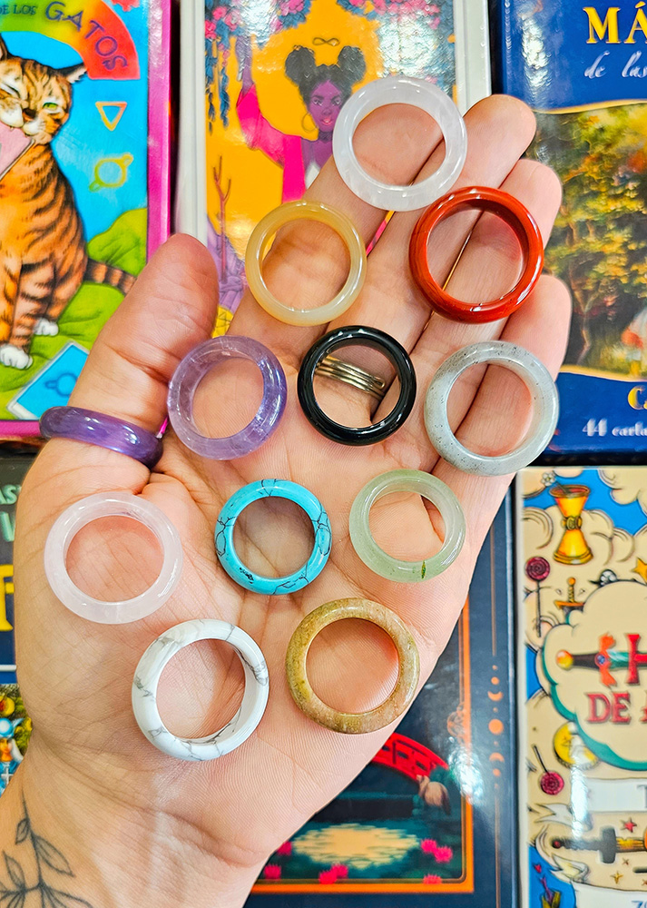 Los anillos de cristales y piedras preciosas además de ser un bello adorno se ocupa también como un amuleto de protección y bienestar según las propiedades de cada piedra.